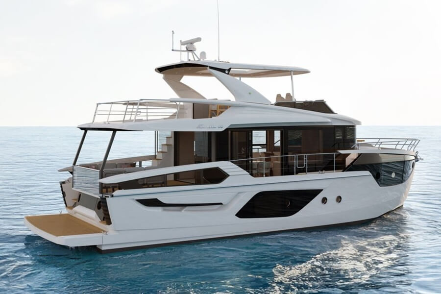Based on a semi-displacement hull, the 58ft motoryacht’s most distinctive elements include the brand’s uniquely shaped ‘squircular’ bow windows, glazed cockpit gunwales to ensure unobstructed views, and reverse-angled aft hull sides to improve access to the water. In addition, integrated shading systems ensure privacy and comfort while at anchor.