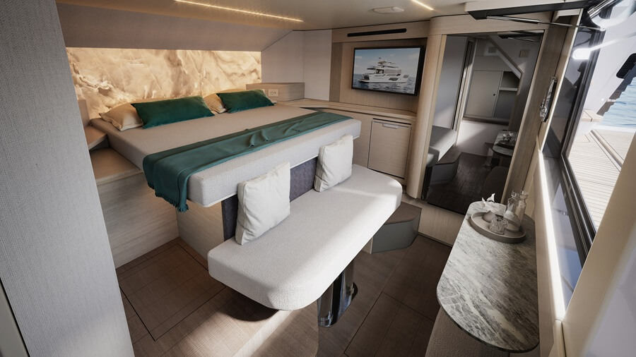 A key element of the yacht’s refreshed design is an additional fourth cabin, created for guests to enjoy infinity-style views out to sea due to its aft location just above sea level. Direct access to the water is also offered via the aft swimming platform.