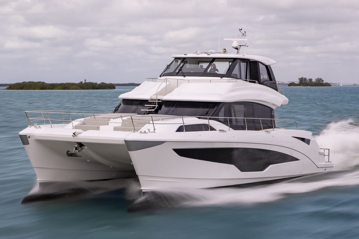 The Aquila 70 had its official world premiere at the 35th Palm Beach International Boat Show, where the powercat builder’s new flagship showed off her sleek lines and enclosed flybridge, the latter also an option on the brand’s popular new 54.