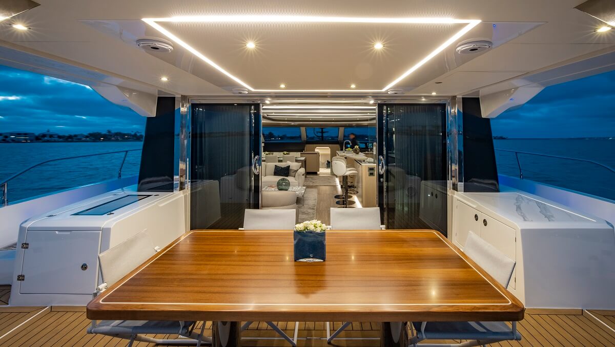 The covered aft cockpit features a dining table and leads to the interior, which begins with a saloon to port and a bar to starboard, while forward are a dining table, galley and a lower helm. The designer furnishings are by Natuzzi Italia, while the galley features touch-control smart appliances by Gaggenau.