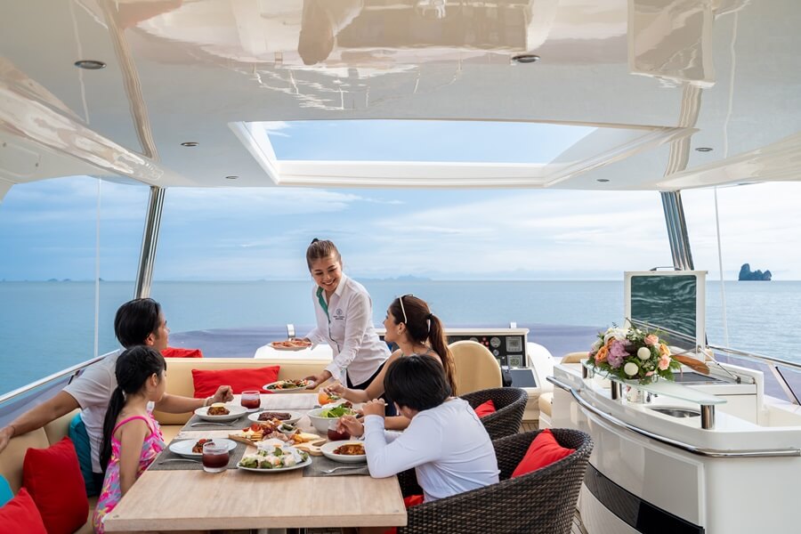 The feeling is that of an open-plan living room that has nearly 360-degree views of the sea thanks to enormous windows and the forward windshield.
