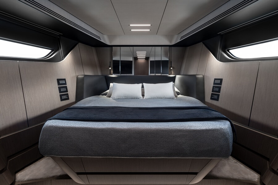 Vallicelli is very pleased with the forward VIP cabin, which feels more spacious than a typical V-berth. This is due in part to the fact that the base of the bed is slanted at an angle inward, rather than straight, creating more floor space beneath the bed and making the room feel larger.