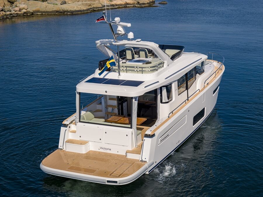 At first glance, it might look like the saloon is full beam, but in fact she’s “almost full beam”. At the aft section of the superstructure, a second set of windows sit further out from the superstructure, framing the side decks and giving the illusion that the saloon is stretching full beam.