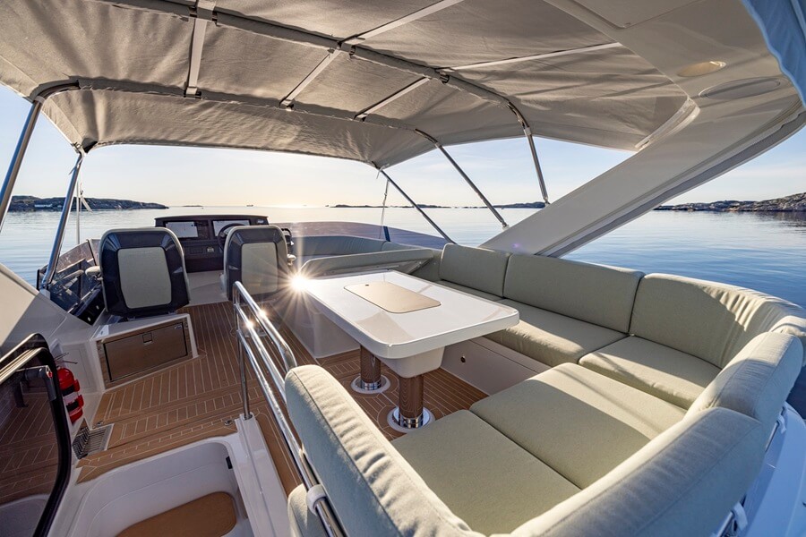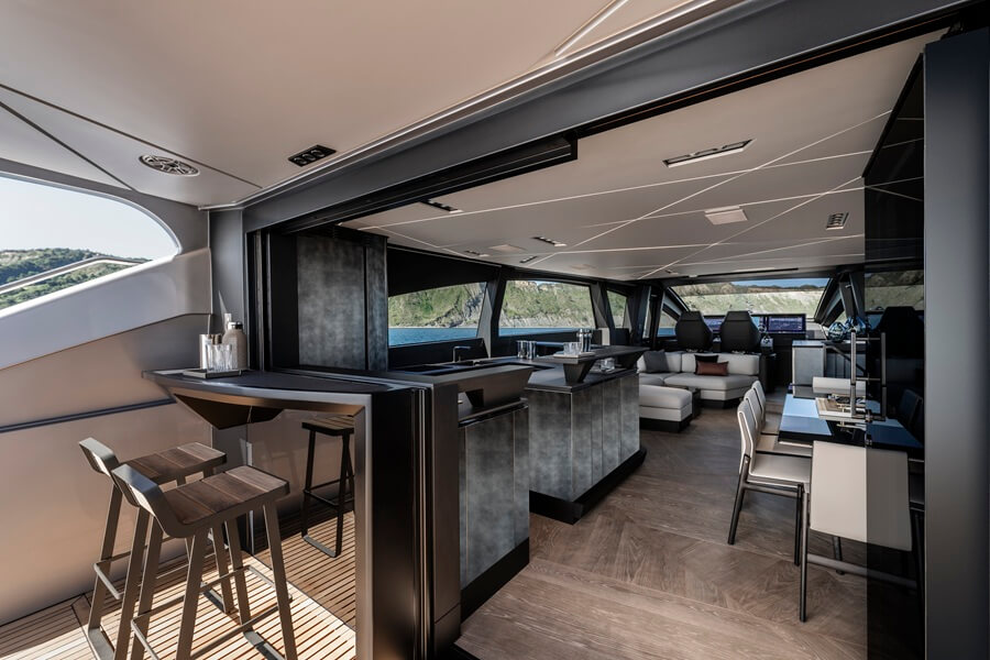 The introduction of crisp, LED lighting highlights the contrasts of the interior decor. The bar area, which starts at the aft and continues inside, is set across from an L-shaped sofa or a formal dining area, depending on which interior layout option is chosen.