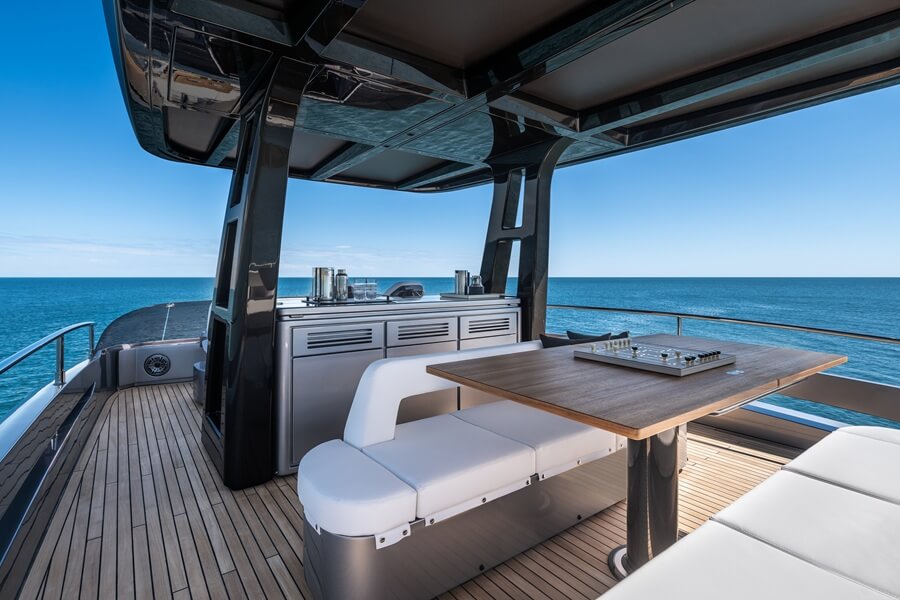 “The Pershing GTX80 is very much focused on what this yacht can offer in terms of more volume for interiors compared to the sport line,” said Vallicelli. “One example is the kitchen, set at the far aft of the main saloon, which connects with the outside.”