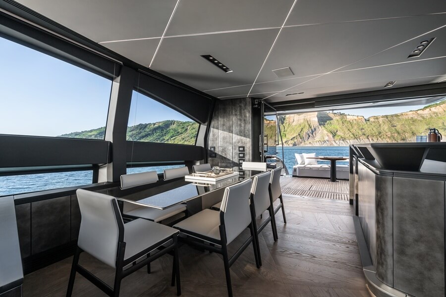 Electrically-operated windows slide down, creating an outdoor bar where guests can sit in the cockpit and directly connect with the kitchen and main saloon. The 36sqm saloon is entered through a door comprising two sliding, overlapping panels from the aft deck.