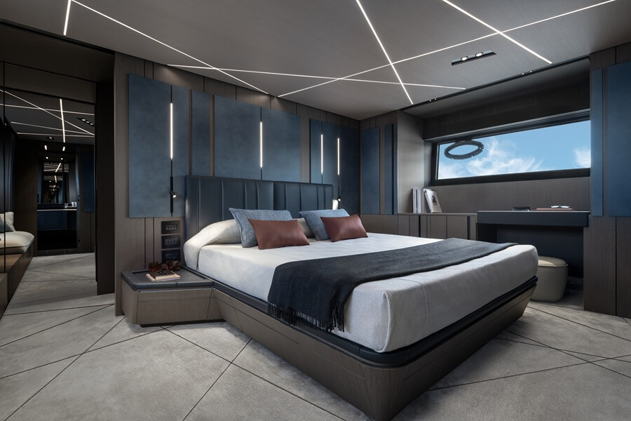 Despite being a production yacht, there is scope for customisation, such as in the owner’s suite, which is clad in blue panelling that can be modified upon request. Owners can personalise the space by changing the hanging panels to a colour and material that best suits them.