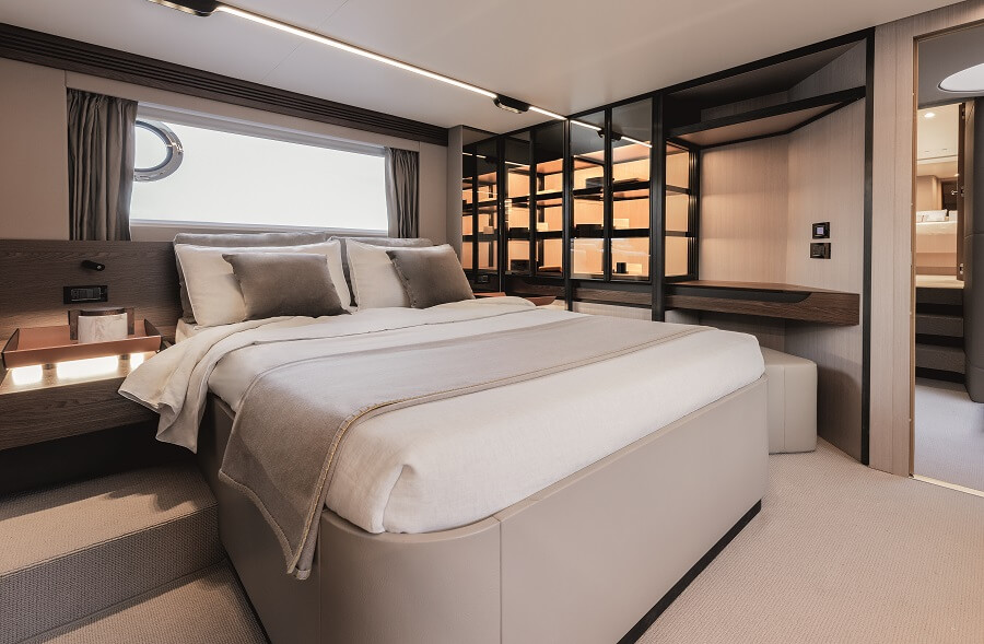 Yachtique designed the interiors as the Italian studio worked on an Azimut model for the first time, focusing on colour shades ranging from cream to almond to dark brown. The main wood is pale Dove grey, while flamed Canaletto walnut is used to finish the furnishings.