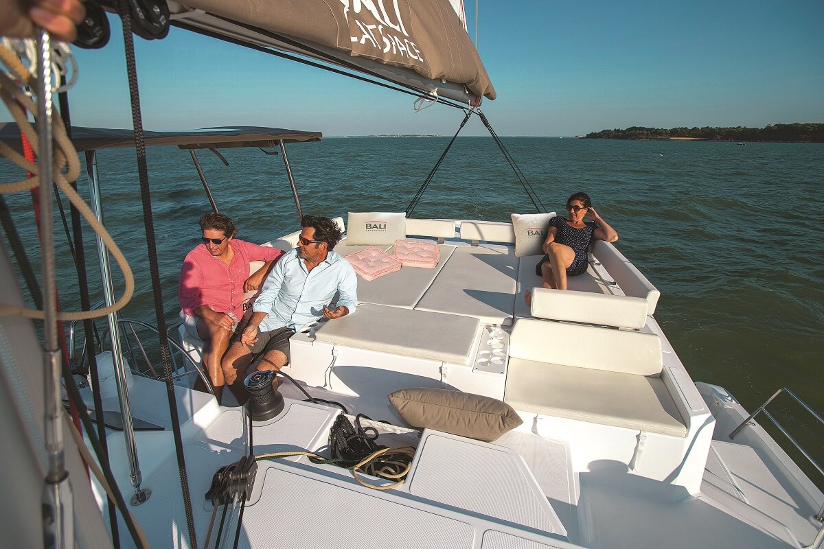 Bali’s signature solid foredeck offers another open lounging area, which surprises with its space. As well as four sunpads arranged in front of the windscreen, there’s also a wide, sunken forward lounge