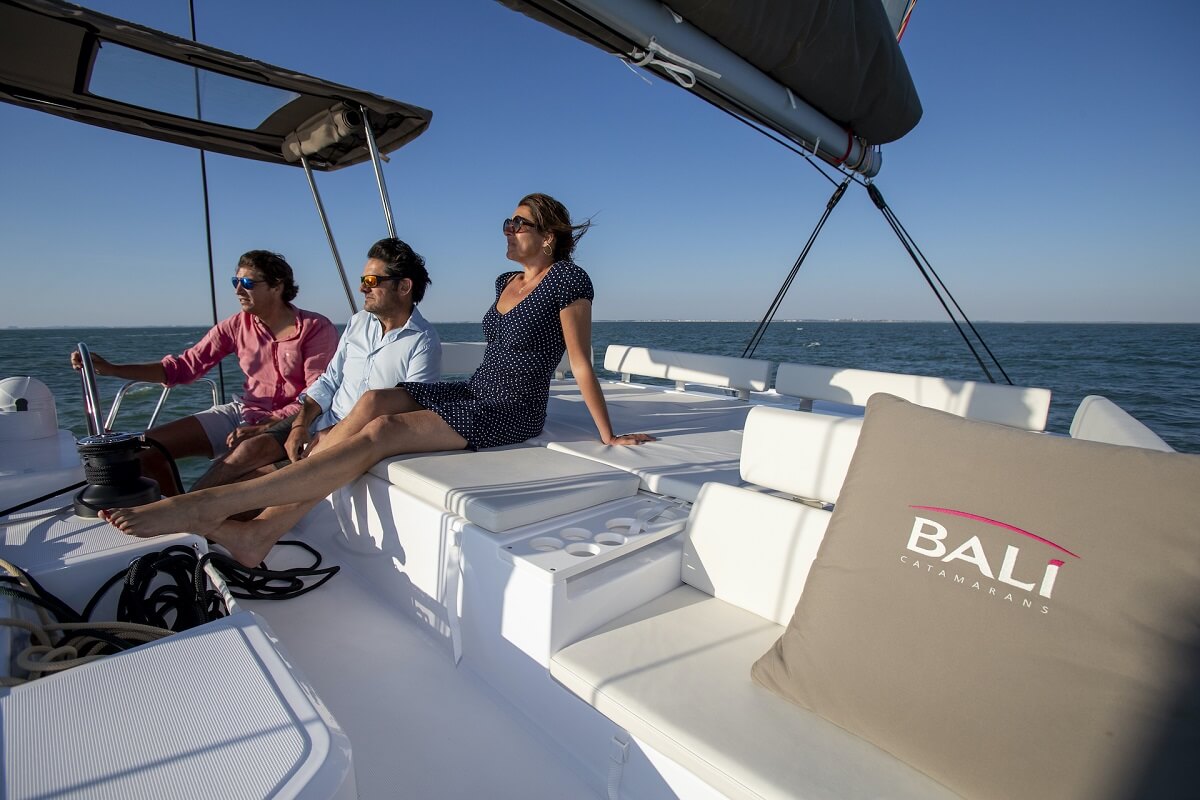 Inheriting the elegant style and racy profile of other models in Bali’s fast-expanding range, which currently extends to the flagship 5.4 (55ft), the Catspace has a refined exterior, with soft lines and inverted bows flaring upwards.