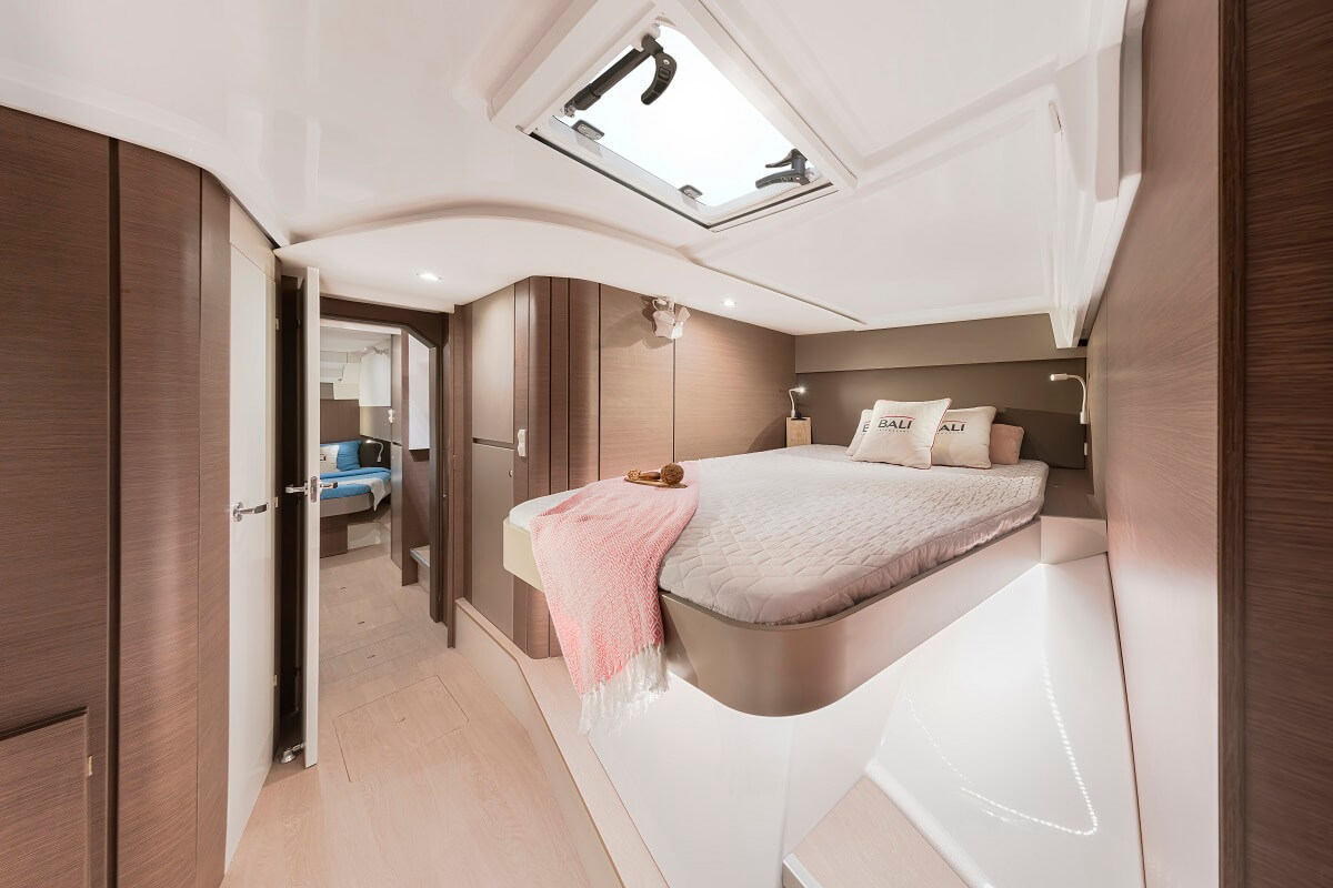 In the four-cabin option, both hulls have matching layouts, with the aft cabin featuring a forward-facing double bed and a bathroom beside the door.