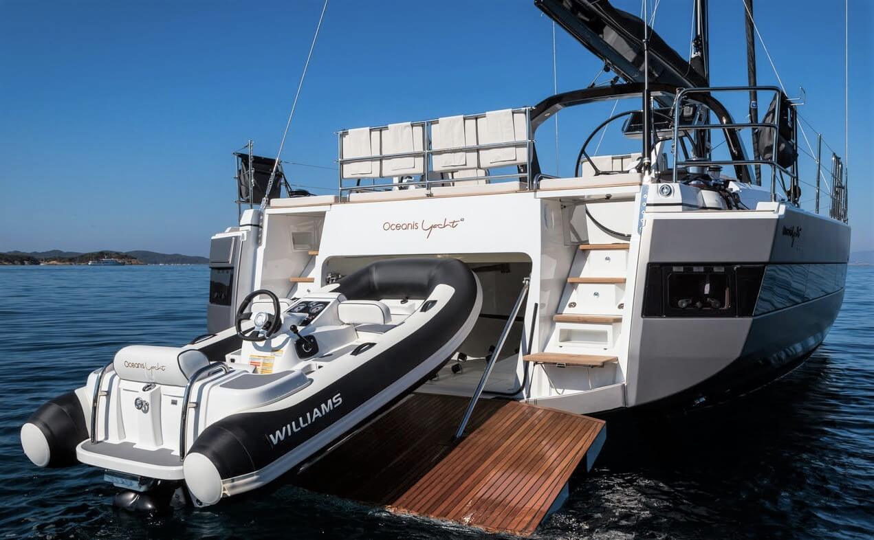 The transom opens to create a large swim platform that accesses the 3.5m by 1.7m dinghy garage, which Beneteau believes is the biggest among similarly sized yachts. Six sun beds are distributed between the stern, cockpit, coach roof and foredeck (double sun bed with lights and speakers built in).