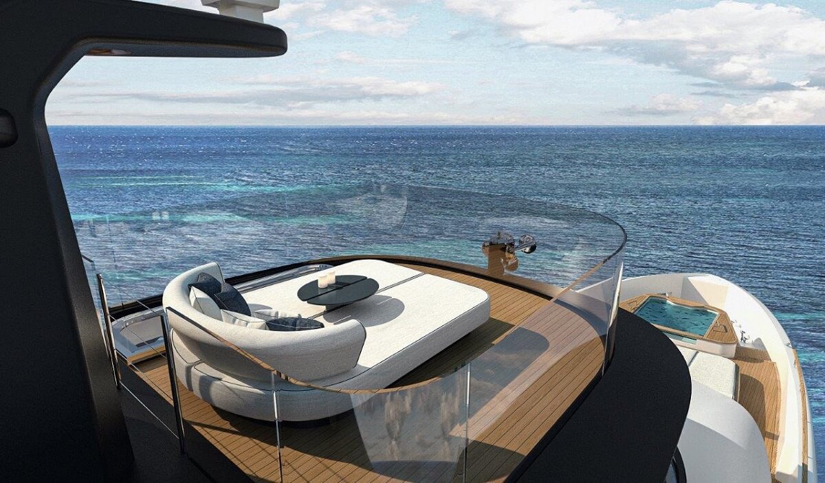 Standout exterior areas include the observation deck on the hardtop, where a private cocoon surrounded by glass offers a private retreat, while the transom door opens up to create a bathing platform and reveal a private area for sunbeds sheltered by a canopy. The garage for the tender and water toys is to the side.