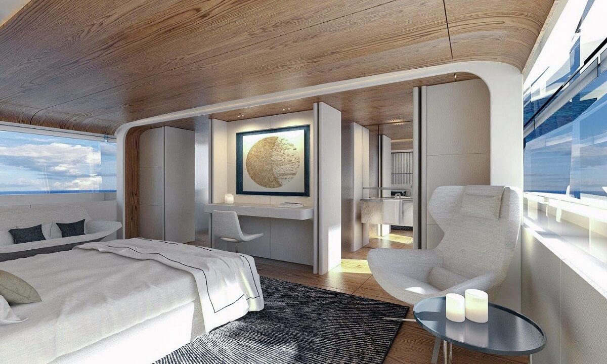 The owner’s suite forward on the upper deck offers expansive views
