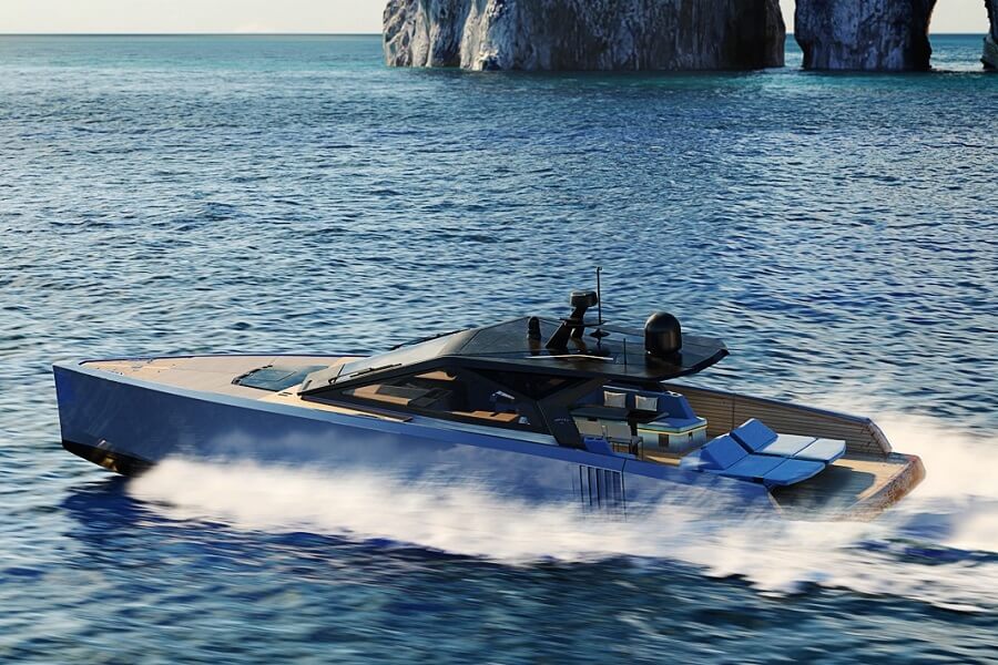 Standard propulsion comprises three 550mhp Volvo Penta D8-IPS700 engines, the IPS system features proprietary joystick manoeuvring, dynamic positioning and Assisted Docking software, while the deep-V hull offers stability in rough conditions.