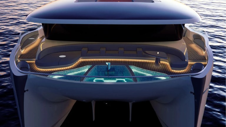 The voluminous interior includes a saloon and dining area on the main deck, along with a TV room/office. The yacht can sleep up to nine guests in four cabins comprising a full-beam master suite, two VIP cabins and one guest cabin, while there’s also accommodation for five crew.