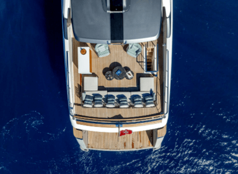 The flybridge deck’s aft sundeck, one of a few spacious outdoor areas