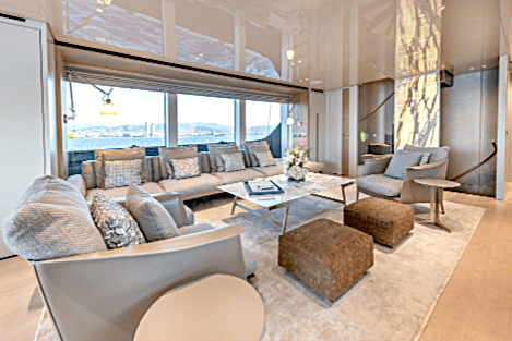 Zuccon International Project also designed the Italian-style interior of Speranza II, creating a warm and inviting space characterised by a calming cream and beige colour scheme, bright, honey-toned marble, and subtle golden accents. Its cosy and modern main salon features a relaxing sofa seating area with large windows on port and starboard.