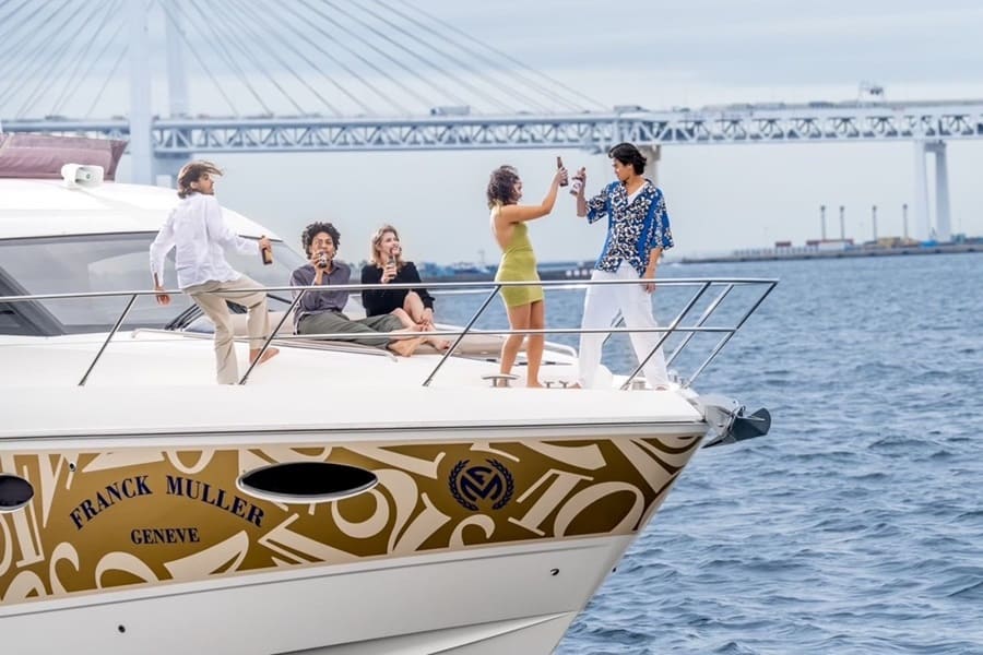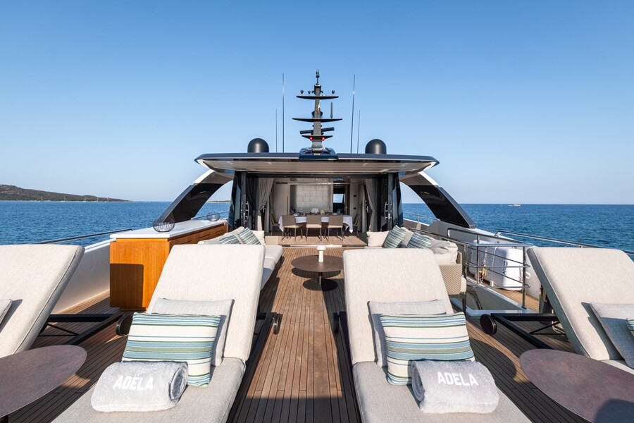 The large party space is multifunctional and can be turned into a helipad, an outdoor cinema with a projector screen, or another relaxation area with six hammocks and various sunbeds. Shade is provided via removable sun awnings on carbon-fibre posts.