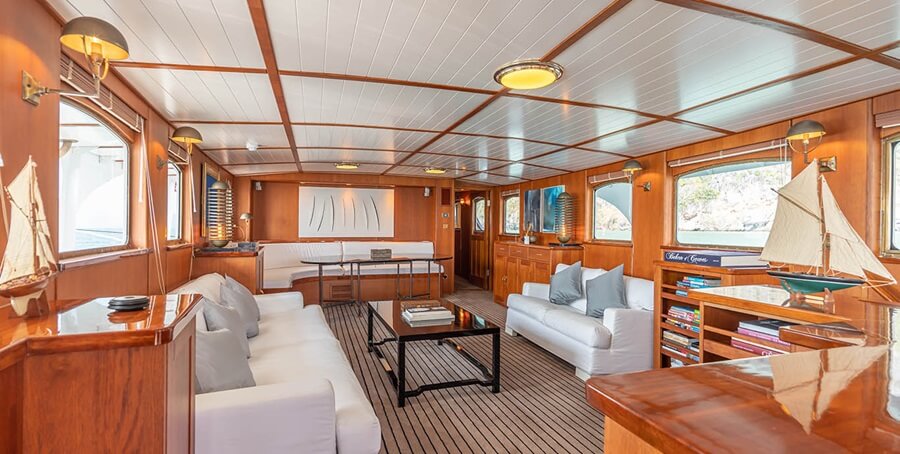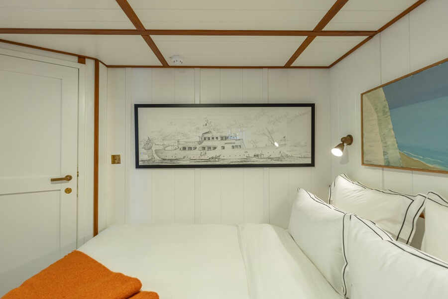 The 122m vessel squeezes in under 5,000GT at 4,918GT. She carries two guests in the enormous owner’s apartment, and 12 others in six substantial suites, plus two auxiliary suites that can be pressed into service. A total of 37 crew are accommodated in 19 cabins.