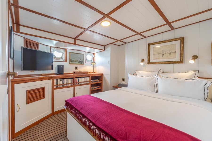 A custom Silverlining desk on the port side complements the room, and the focal point is the large red L-shaped sofa, from which to enjoy both the scenery and the large TV that drops down from the ceiling.