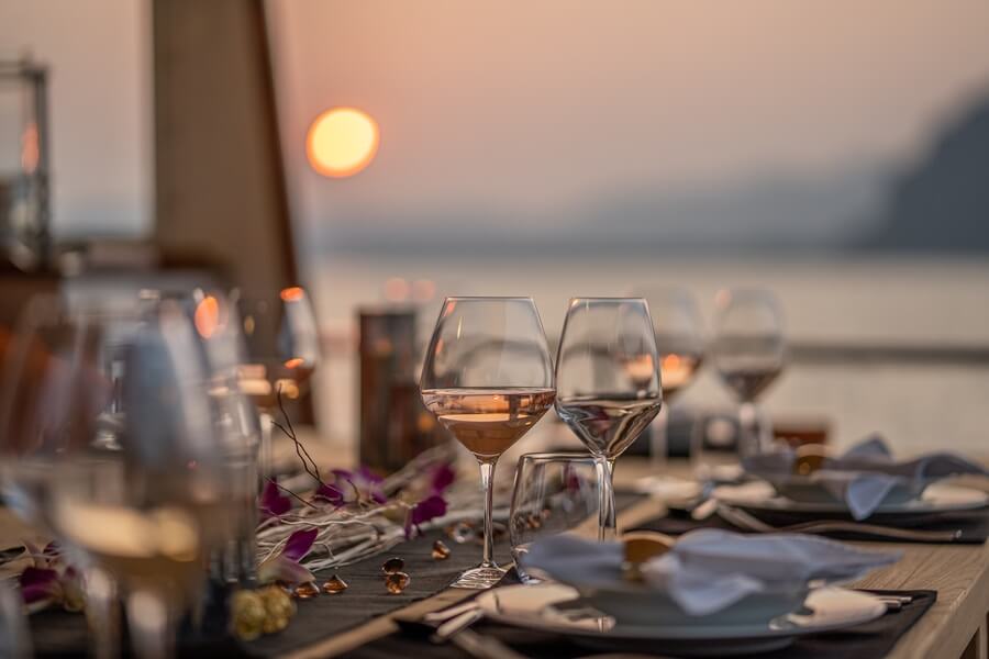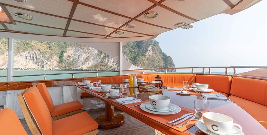 Directly under the mast is a stone-topped dining table which seats 14 guests. Three television screens, a bar, beer fridge and gas-fired pizza oven ensure this is a social and casual place to relax. At the top of the staircase that leads down to the bridge deck aft is a round overhang, which is set up as a DJ station during parties on the deck below.