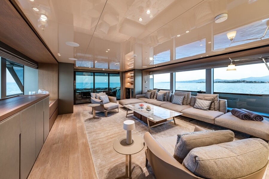Forward of the pool deck is the owner’s office, with private access down to the master suite below. The office is designed to be dual-purpose, with convertible sofas that can also be used as an extra guest cabin.