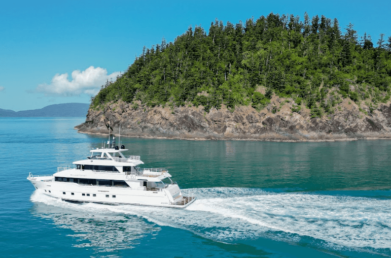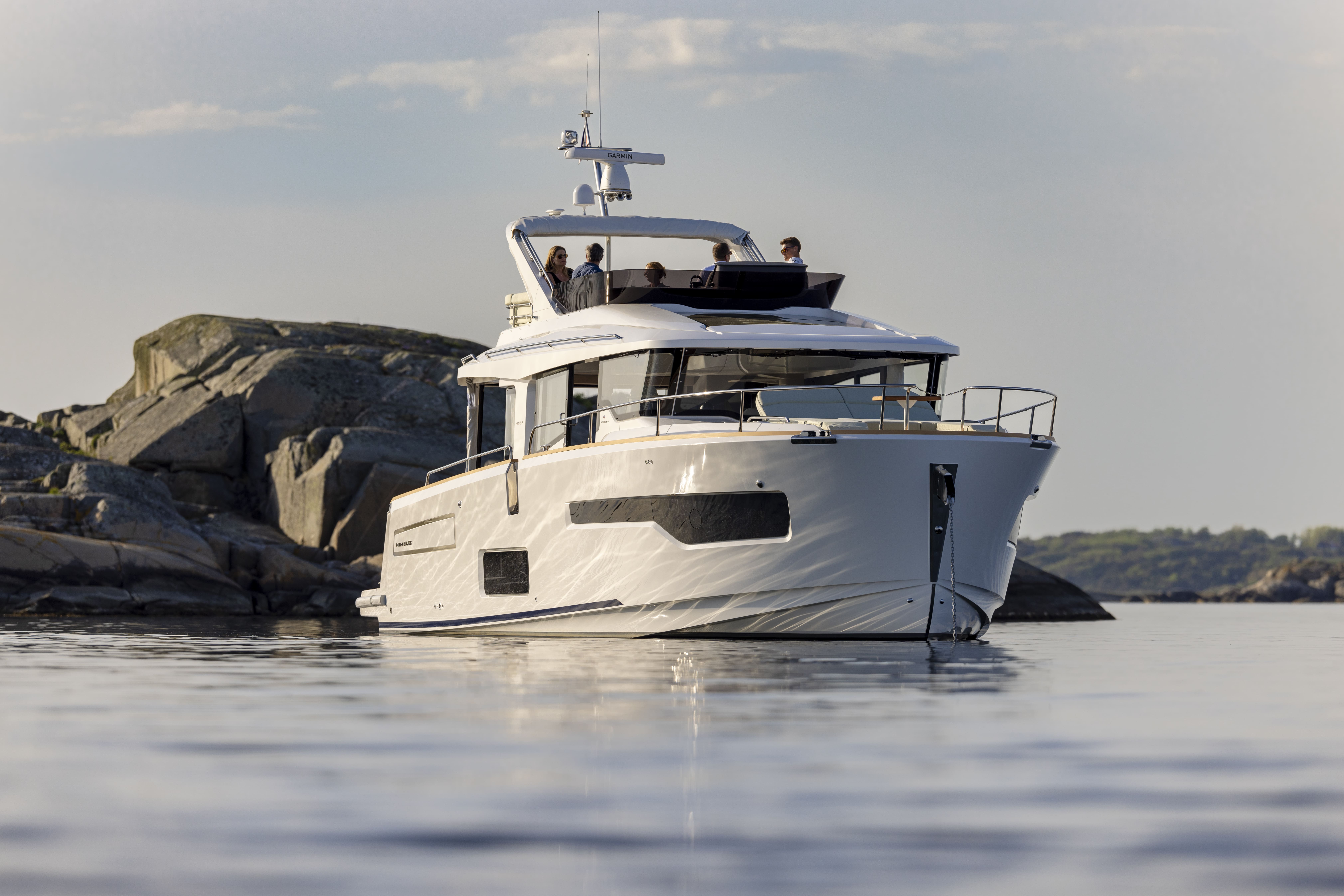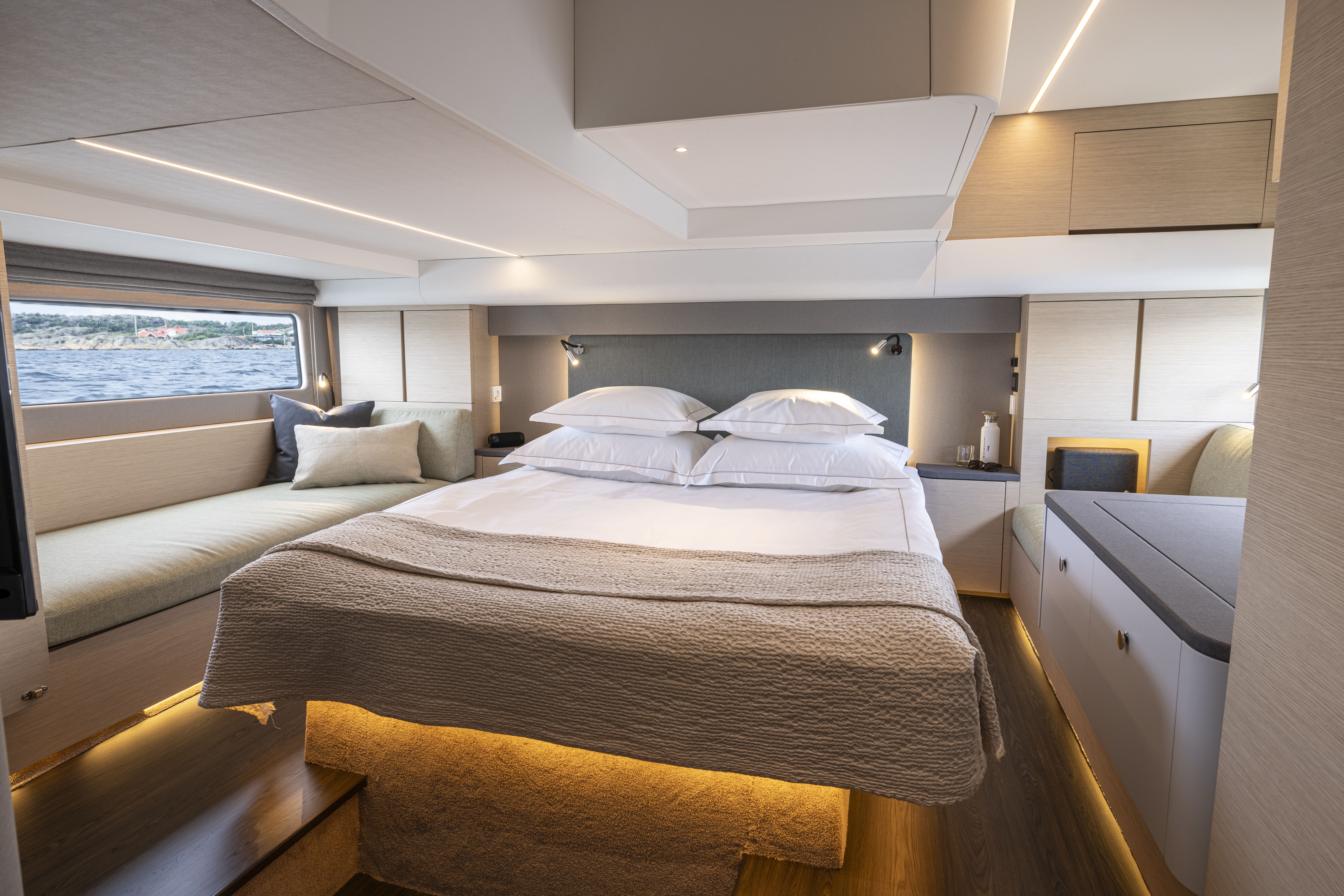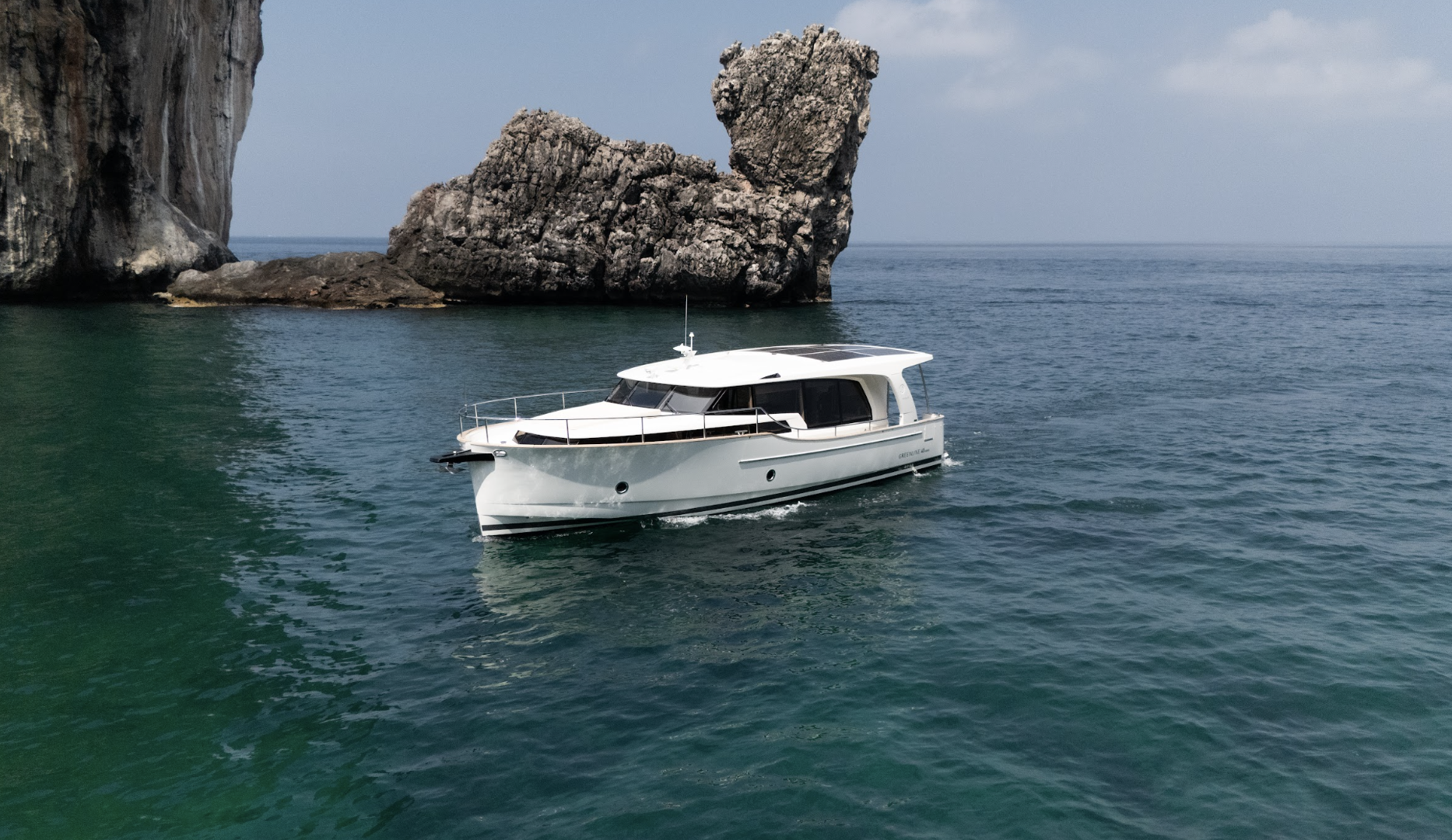 The hybrid experience offers smooth cruising, an electric boost in acceleration, and excellent driveline response; the package also features Joystick Docking in Pure Electric mode, which is smooth and responsive. The extensive battery bank supports off-grid living and quiet electric cruising at low speeds allows closer proximity to nature and access to protected areas. During nights at anchor, the system enables silent, comfortable off-grid mooring, with batteries recharged during the voyage or while docking.