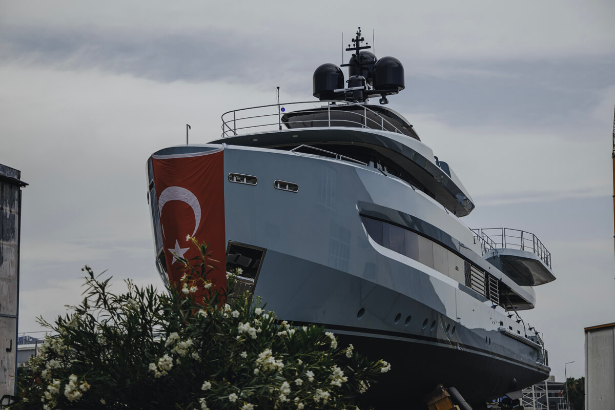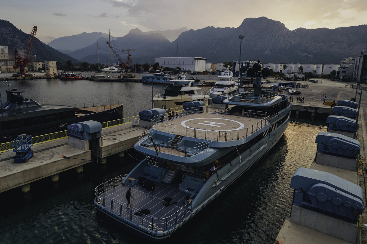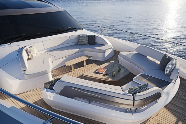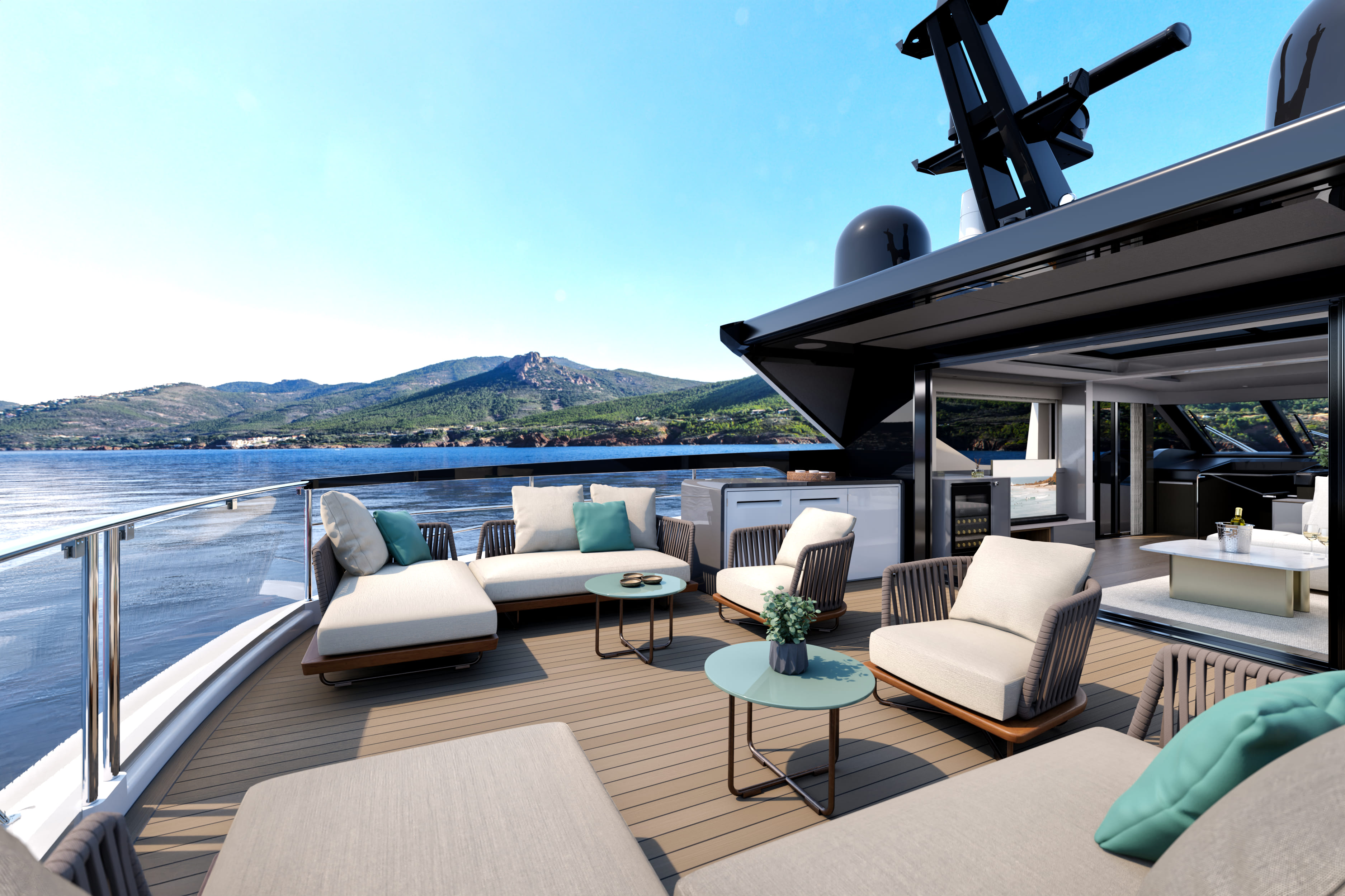 Above, an optional sliding roof spans the width of the main deck, for air flow through the saloon. The foredeck terrace, a popular feature from the Y80, continues to adapt to owners’ lifestyles with two U-shaped seating areas plus a sun pad conversion.