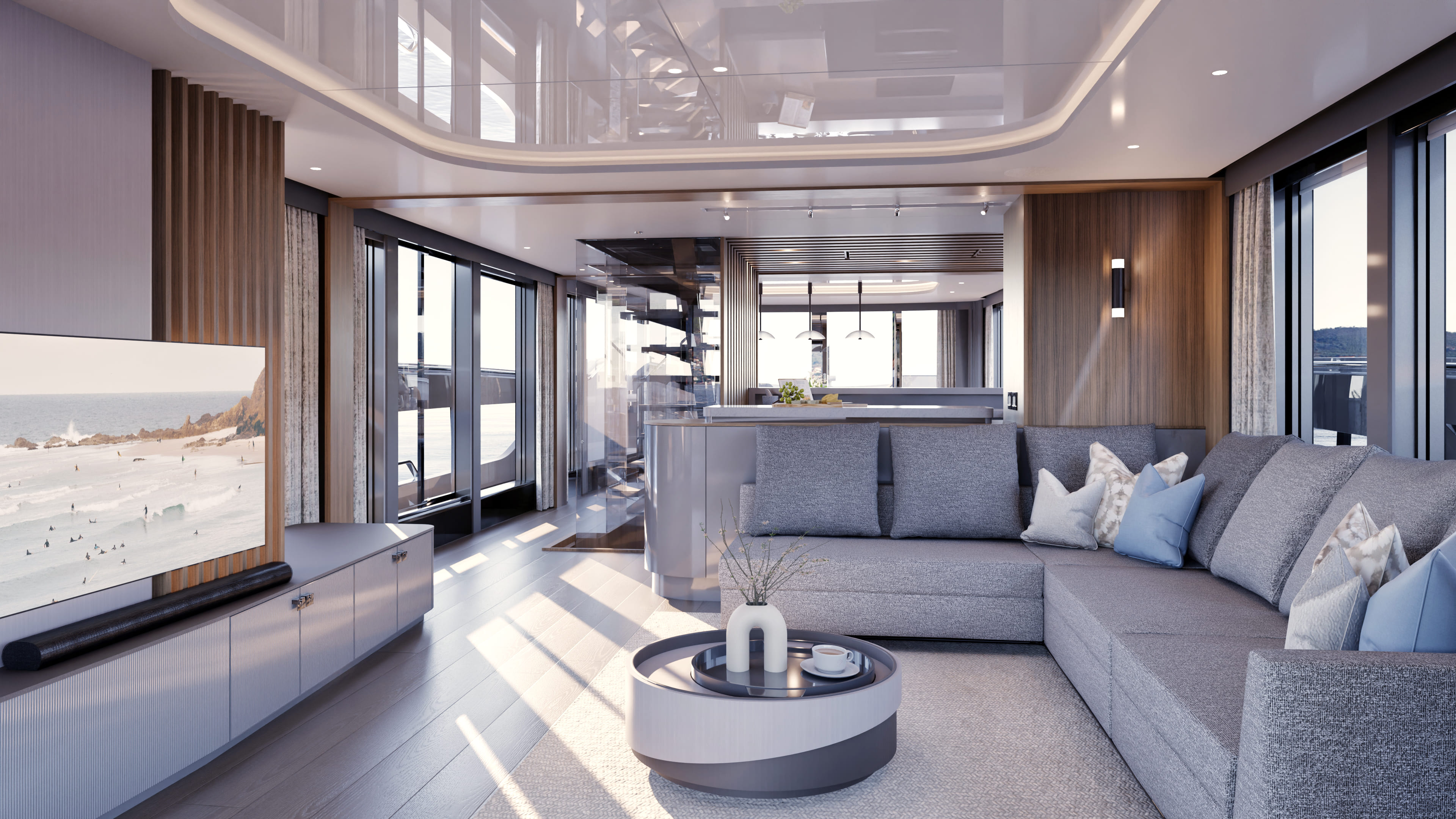 The 28.7sqm sports-bridge is yet another impressive outdoor living space with multiple seating areas and wet bar, with barbecue and refrigeration. A dining table and an outdoor TV are also available.