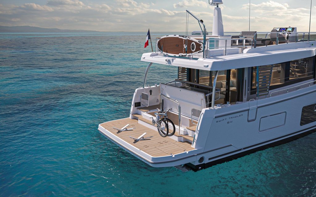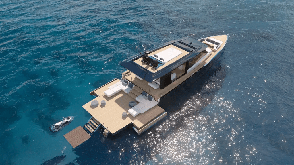 The ‘life outdoors’ theme continues into the flexible cockpit that inspires relaxation with a large sun pad aft, stretching over the garage that is capable of housing a 3.3m tender. Forward is the U-shaped seating and dining area with a folding teak table.