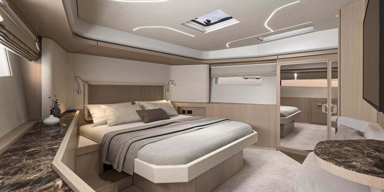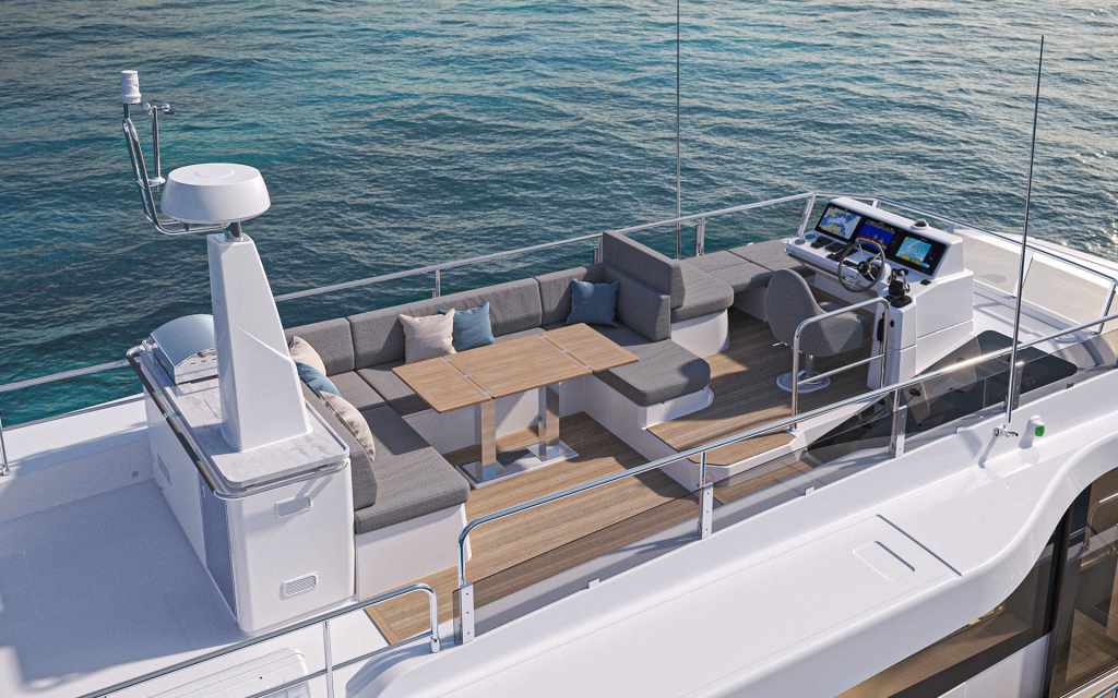 Light from the panoramic windows floods the saloon. A spacious C-shaped sofa sits opposite the port seating area, while the helm offers access to all on-board controls. A pantograph door gives the captain direct access from the starboard side deck through to the foredeck for easy mooring and communication.