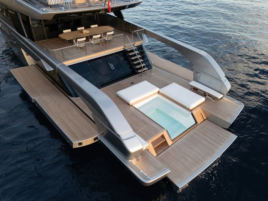 The forward part of the hardtop includes louvres to allow for sun or shade, while a lounge area aft sits under a solid hardtop. A retractable TV serves both the bow sunpads and mini pool, as well as the stern seating area.