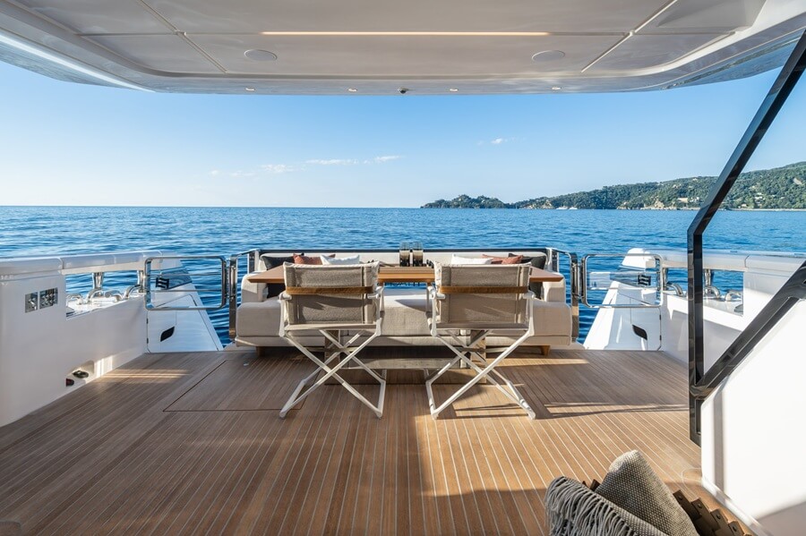 Aft view of the sheltered, private main-deck cockpit and, above it, the open mezzanine deck offering sea views