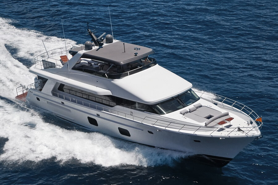 The yacht features a resin-infused composite hull and strategic use of carbon-fibre. The model will be powered by twin Volvo Penta IPS1050 pods (with optional Assisted Docking system), and has a zero-speed fin stabilisation system. A second hull is already under construction.
