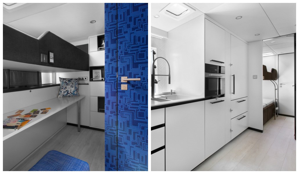 Both children’s cabins comprise bunk beds and desks for schoolwork. The port hull features the main galley, which connects with the crew quarter and the captain’s cabin.