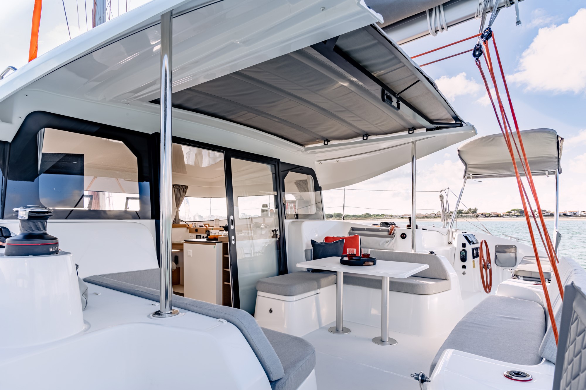 The cockpit can be covered by a retractable bimini