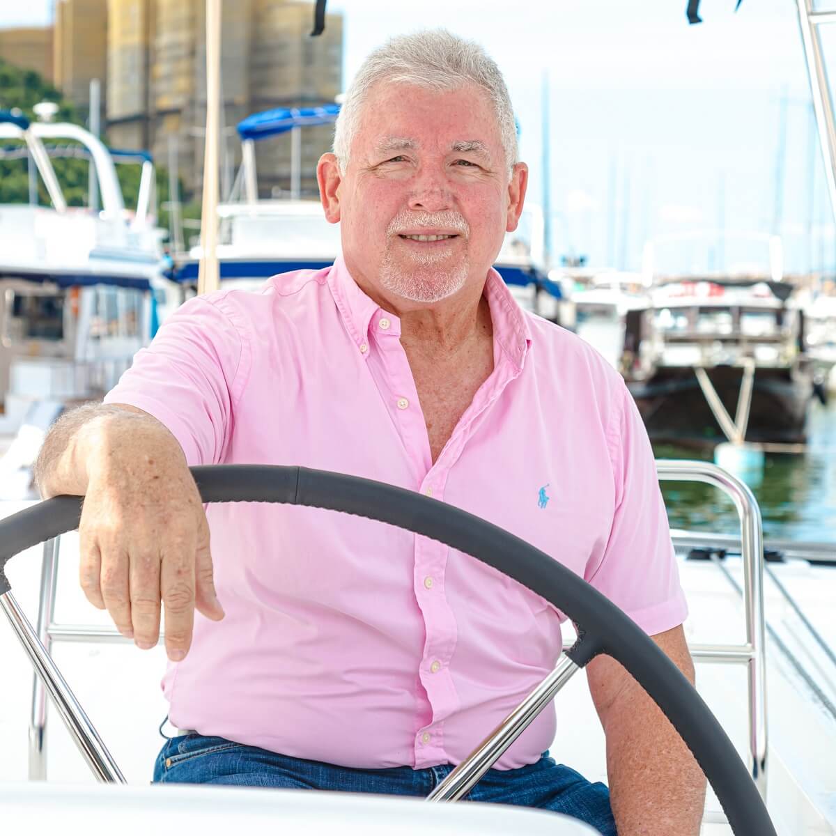 Frank Coles at the wheel of his Lagoon 46 Kariwa