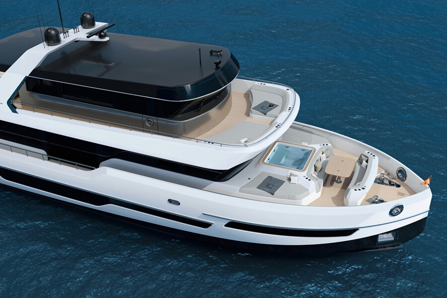 The result is a compact and efficient go-anywhere explorer that packs the features and spaces typical of a larger yacht.