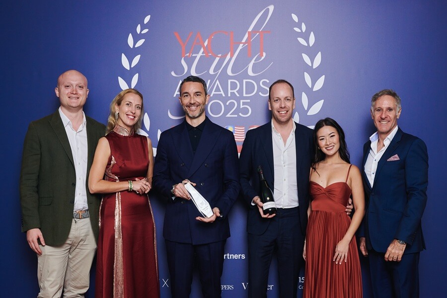 After the Sanlorenzo 50Steel won the Superyacht 40-60m category at the 2025 Yacht Style Awards in Singapore, Daniele Lucà held the trophy with, from left, Harvey Brewin (Country Manager Singapore), Ewa Stachurska (Chief Marketing and Sustainability Officer), Nick Stratton (Chief Sales Officer), Jeanette Teo (Regional Marketing Manager, SEA) and Paul Whelan (Country Manager Indonesia)