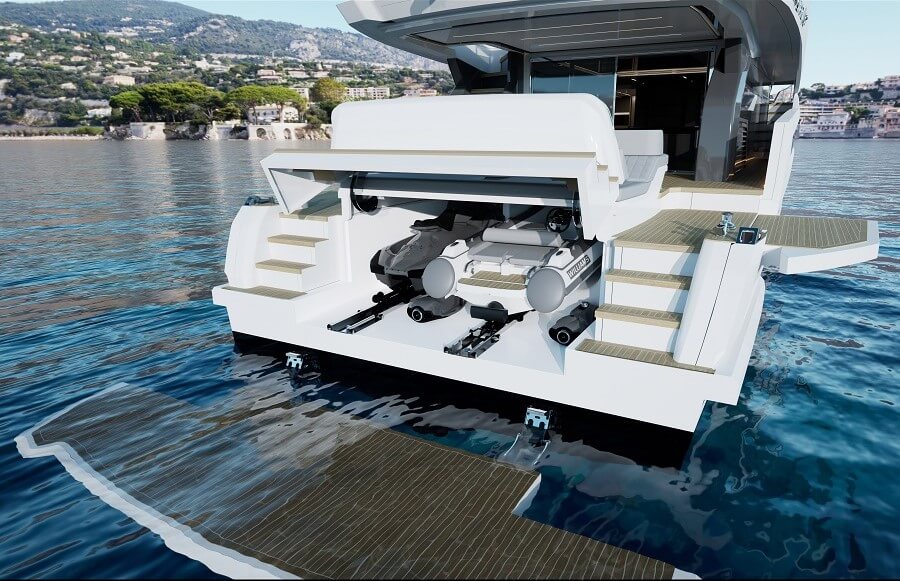 Features include fold-down wings at cockpit level, a change from the builder’s flagship Pearl 95, where the wings are either side of the swim platform. The Pearl 82’s garage offers space for a tender up to a Williams SportJet 345 as well as a jet-ski and other water toys.