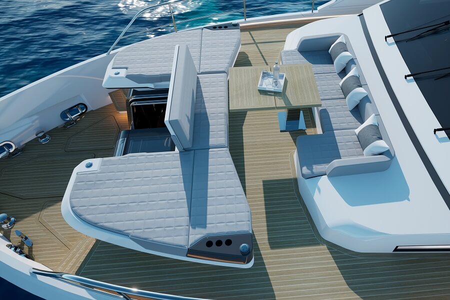 A private terrace in the forepeak is accessible from the master suite and from the flybridge, with a dedicated opening to port midships. The foredeck lounge is just a few steps up and has sunpads and a sofa around a cocktail table, and can be covered by a bimini.