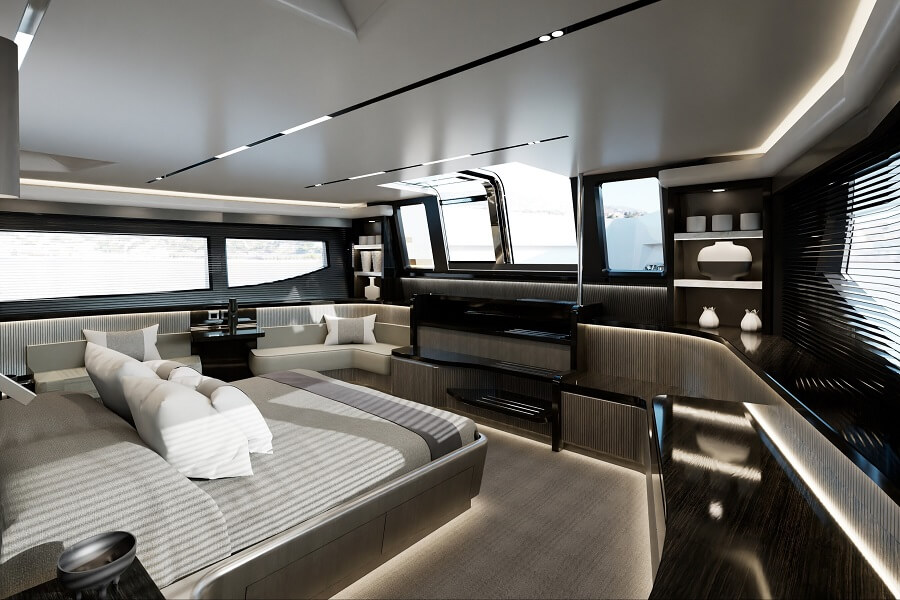 Inside, the saloon has floor-to-ceiling windows to enjoy views aided by cut-outs in the bulwarks. A forward dining table for 10 guests sits before an eye-catching bar. The galley is accessed to port and the master suite entry is on the starboard side. Engine-room access, galley access and foredeck access are all positioned on the port side of the yacht, ensuring privacy for guests and crew.