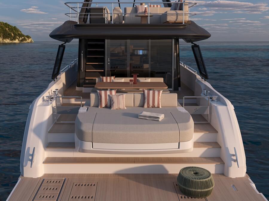 Outdoor areas include the flybridge, which is fitted with a wet bar and one or two-seat helm station to port, and a dinette and forward sunpad to starboard, while the aft area can remain clear or include loose furniture. The foredeck includes a forward-facing sofa and a large sunpad that can adjust to include an aft-facing sofa.