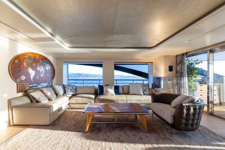 “It’s basically a private saloon for the owner,” Beani says. “The philosophy of the yacht is to live outside, so even when you’re inside in the master suite, you can completely open the verandah door and have the room fully open to the outdoors.”