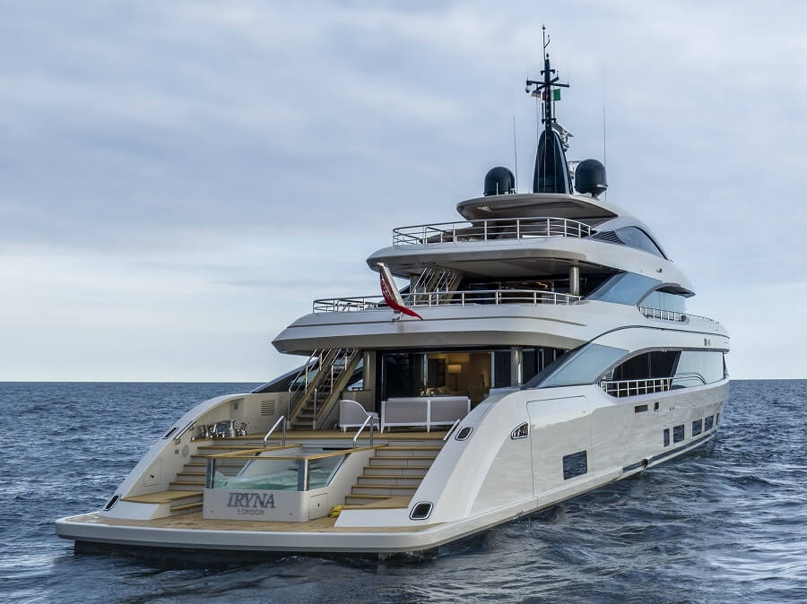 When viewing from a dock or boarding, it’s the beach club that first welcomes you and Iryna features the model’s traditional aft deck. As well as the pool, the beach area includes an internal zone that can be accessed through a gullwing hatch on the starboard side as well as a stairway from the main deck.