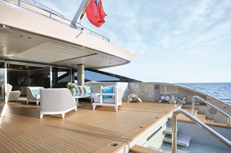 The main deck starts with a partially covered aft deck or cockpit. On Iryna, the area features two curved sofas and two chairs around an oblong coffee table, with guests able to enjoy views of the pool and sea.