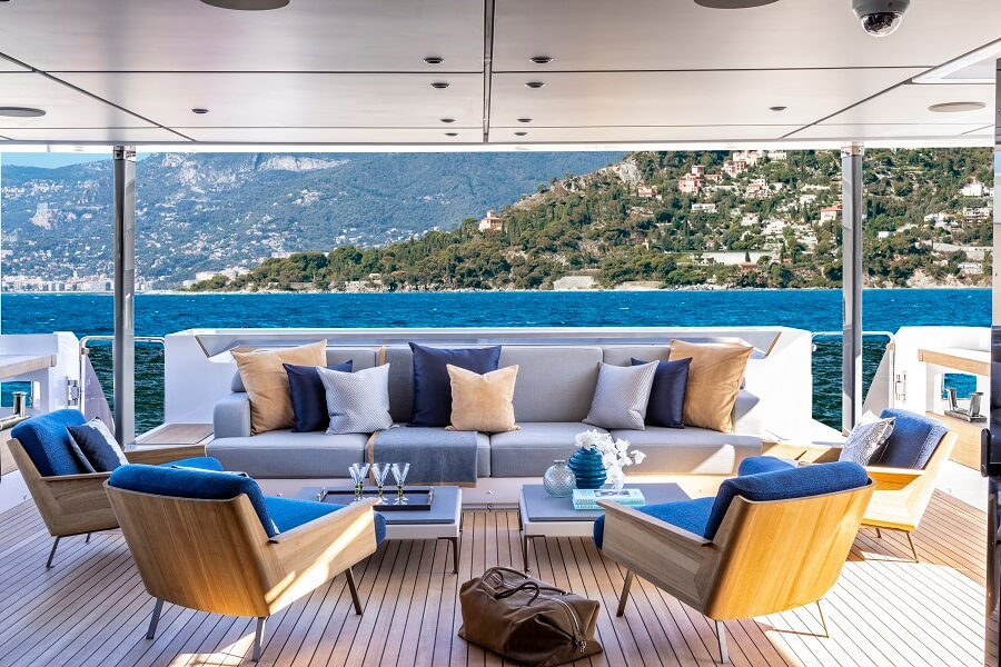 The designers also wanted the yacht to have a holistic flow, with indoor and outdoor spaces merging into one. On the aft main deck, the door leading into the main saloon completely opens, and the floor is flat so there’s no step up or down to go inside, both of which create an open feeling.