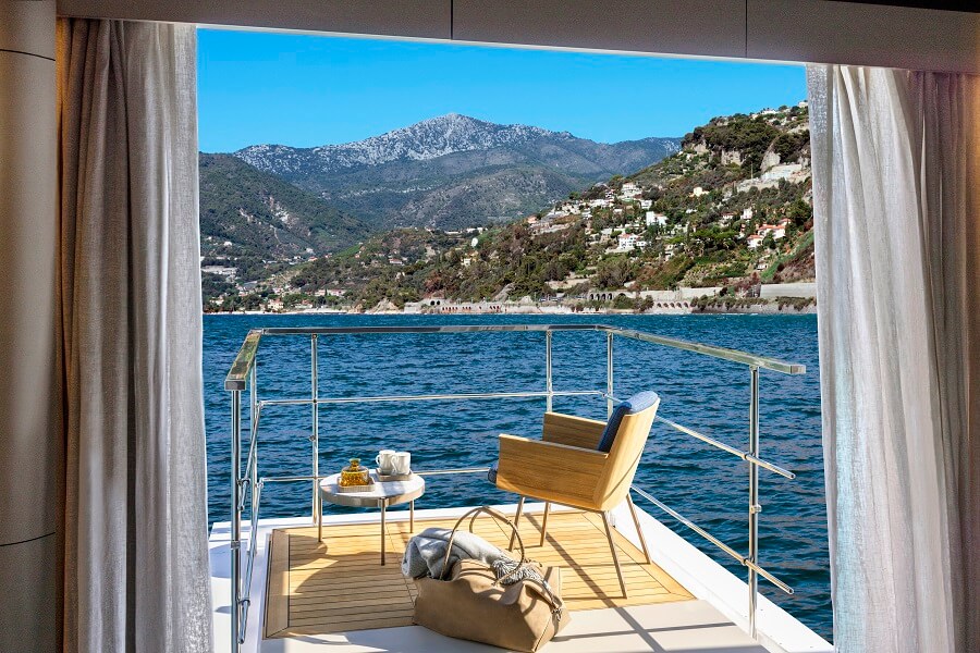 A strong example of this is forward on the main deck, where the 47sqm owner’s suite takes advantage of the 8.4m beam and includes a fold-out balcony for a pure connection with the water. The optional folding terrace is built into the hull and is designed so the owner can operate it without assistance from the crew.