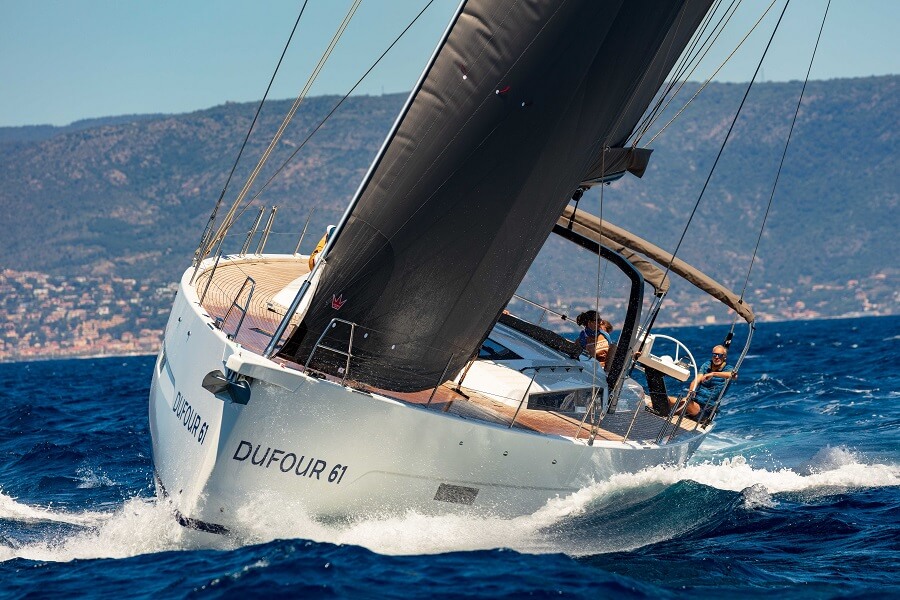 Wind speeds of 15-20 knots are perfect for this design. On flat water, you can expect to sail in the nine-knot range and enjoy pointing up to 40 degrees where the Dufour 61 is still comfortable and doesn’t feel overpowered.